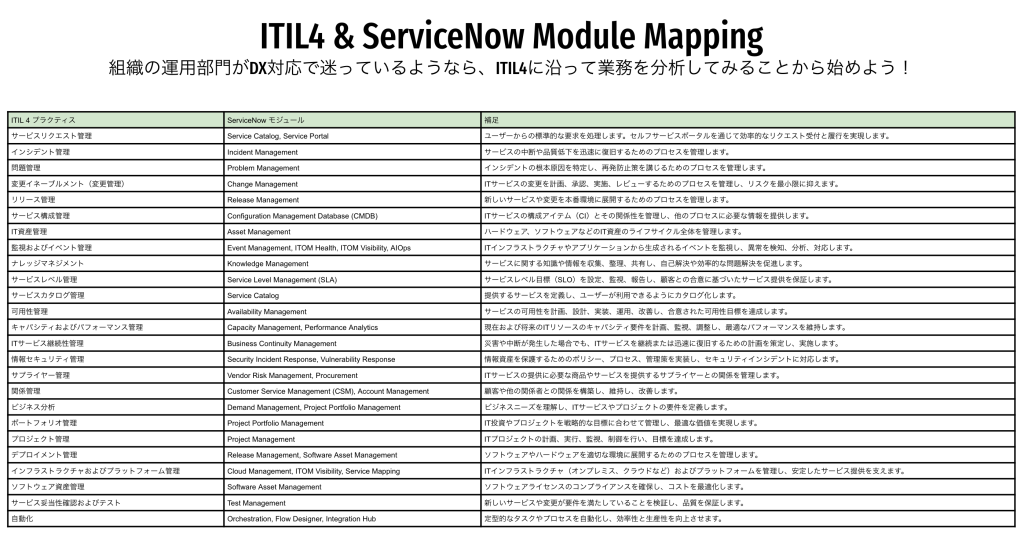 - ITIL4の「サプライヤー管理」「関係管理」プラクティスに基づき、ServiceNowを活用した顧客ポータルやサプライヤー連携の仕組みを検討・構築支援(変革推進担当者が中心となり、関連部署や外部パートナーとの連携を推進)